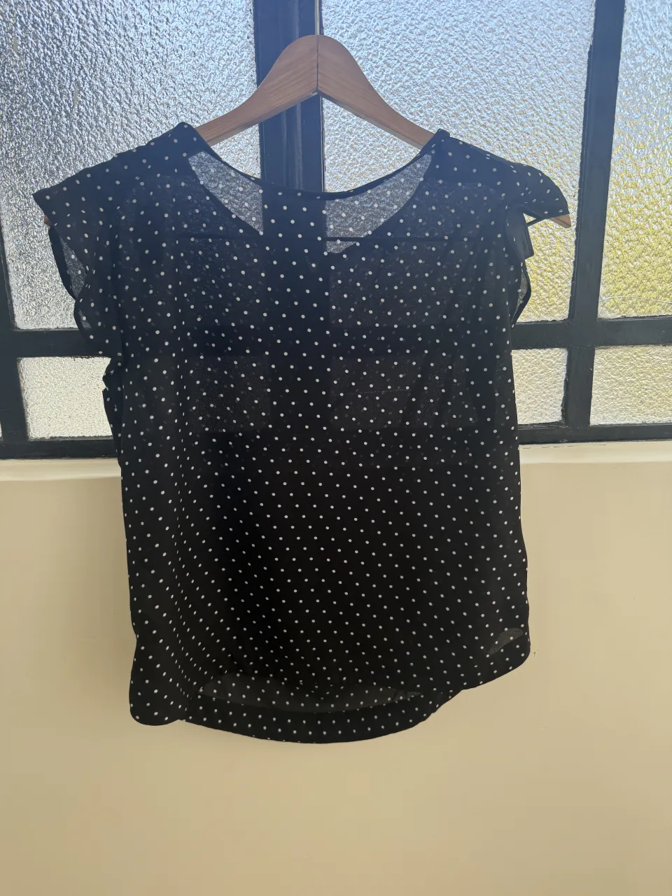 Remera negra con lunares blancos, ideal para un look casual y canchero. Tiene un detalle de cierre en la espalda y mangas con volados.