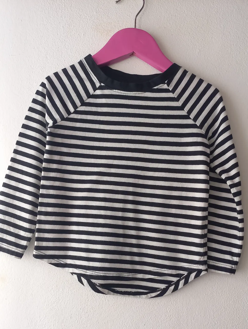 Remera a rayas blancas y negras, manga larga, con cuello redondo. Medidas. De axila a axila: 28 m, largo de manga: 37 cm, largo total: 37 cm