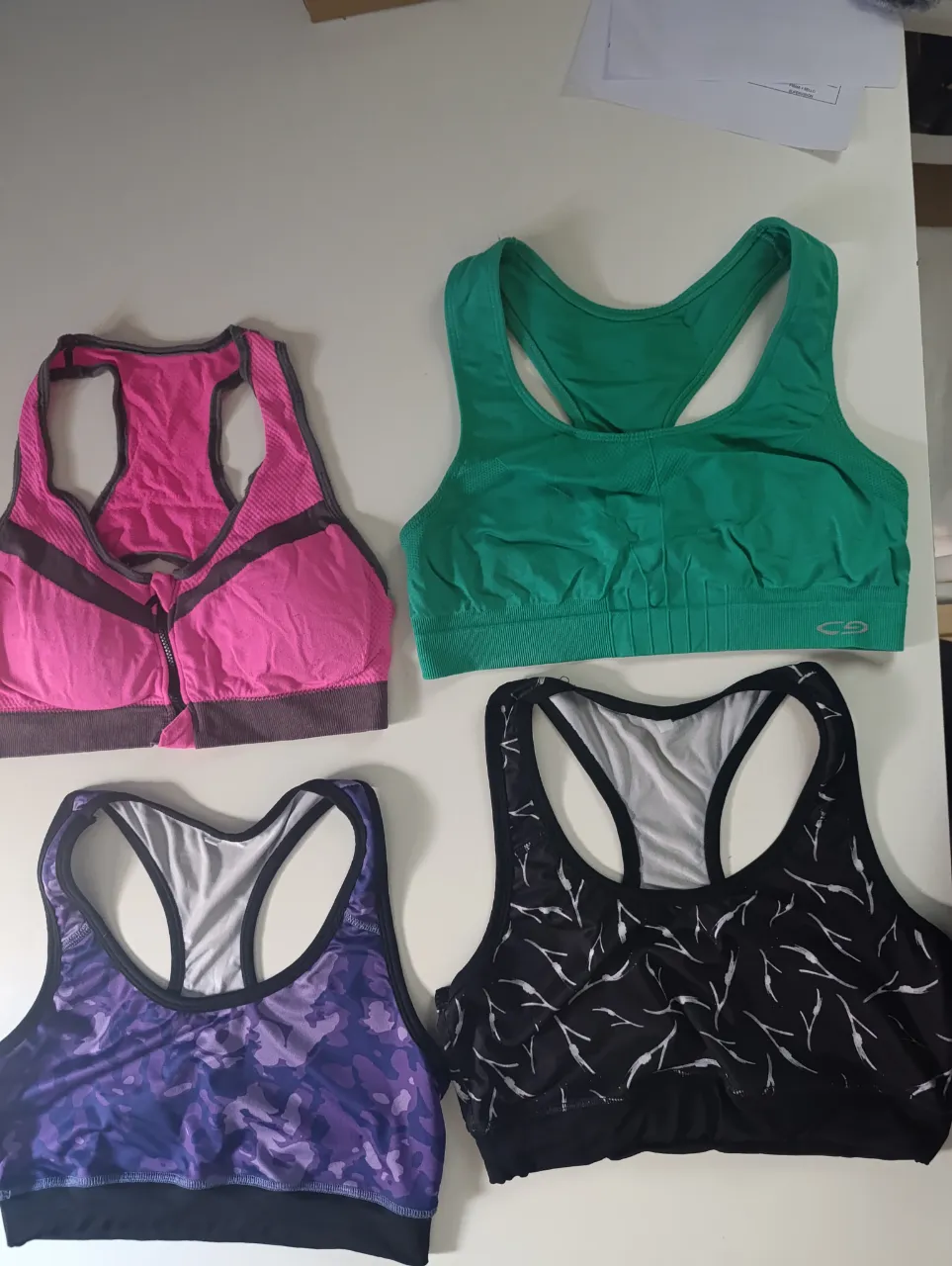 Lote de 4 tops deportivos, ideales para entrenar o para un look casual. Incluye un top rosa con cierre delantero, uno verde liso, uno con estampado camuflado en tonos violetas y otro negro con estampado abstracto. ¡Perfectos para tu rutina de ejercicios!