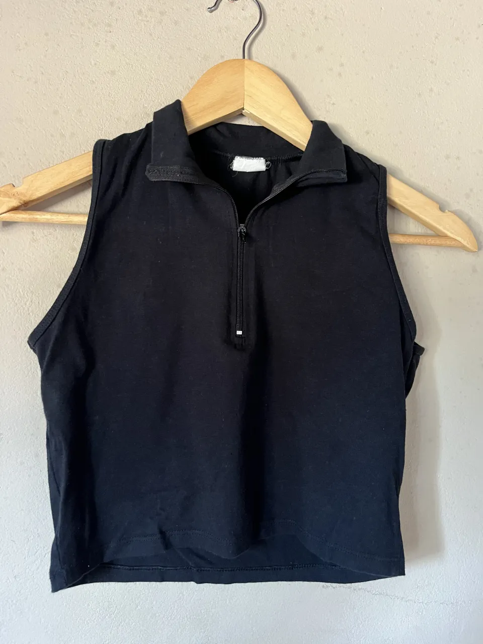 Musculosa negra con cuello tipo polo y cierre metálico al frente.