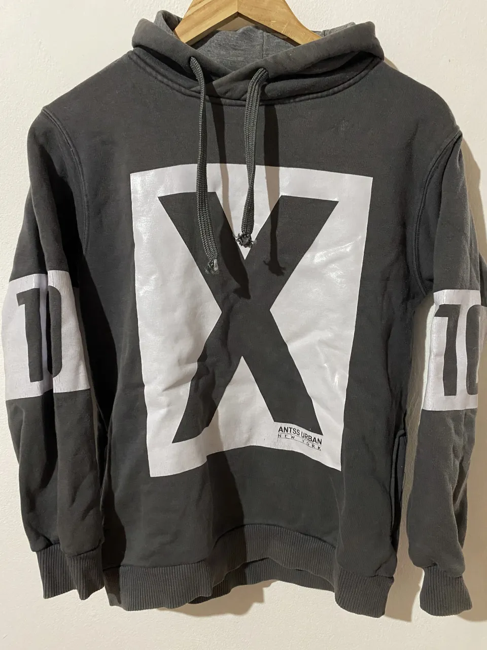 Buzo gris oscuro con capucha y cordones. Estampa grande de "X" blanca en el frente con texto "ANTSS URBAN NEW YORK" debajo. En las mangas, a la altura de los hombros, tiene estampados los números "10" en blanco. Interior del buzo de plush gris.