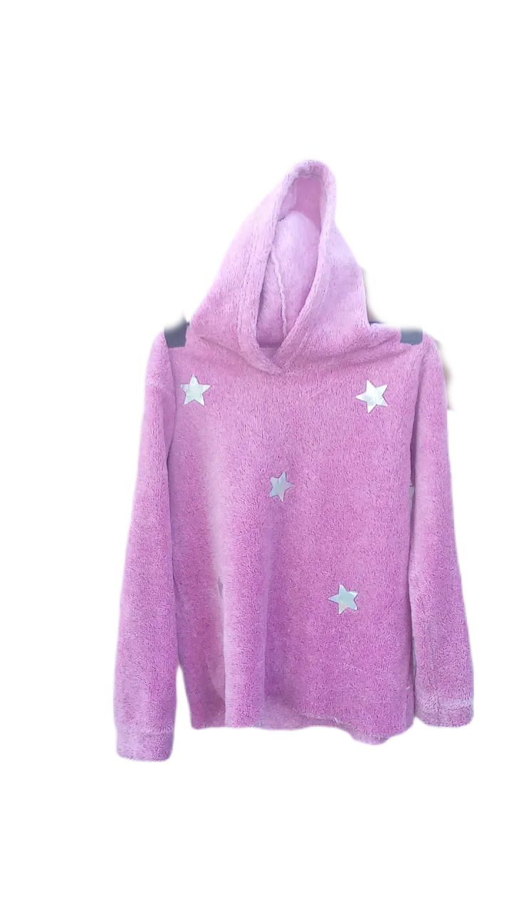 Buzo rosa de plush con capucha y estrellas plateadas estampadas. Tiene detalles en los hombros.