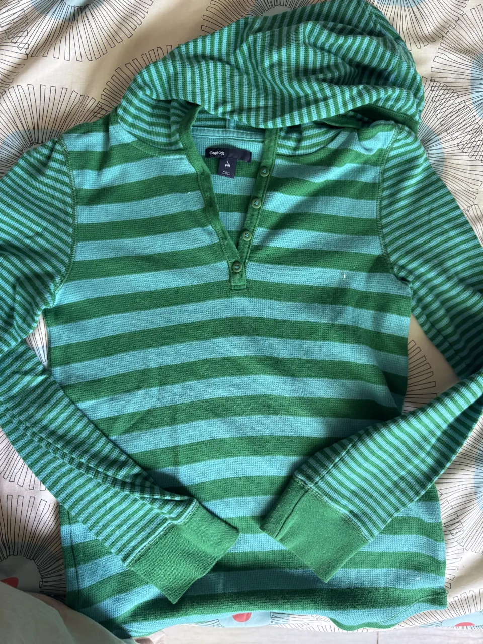 Remera a rayas con capucha, ideal para el día a día. Su diseño a rayas verdes y celestes le da un toque moderno y canchero. Perfecta para un look casual y cómodo.