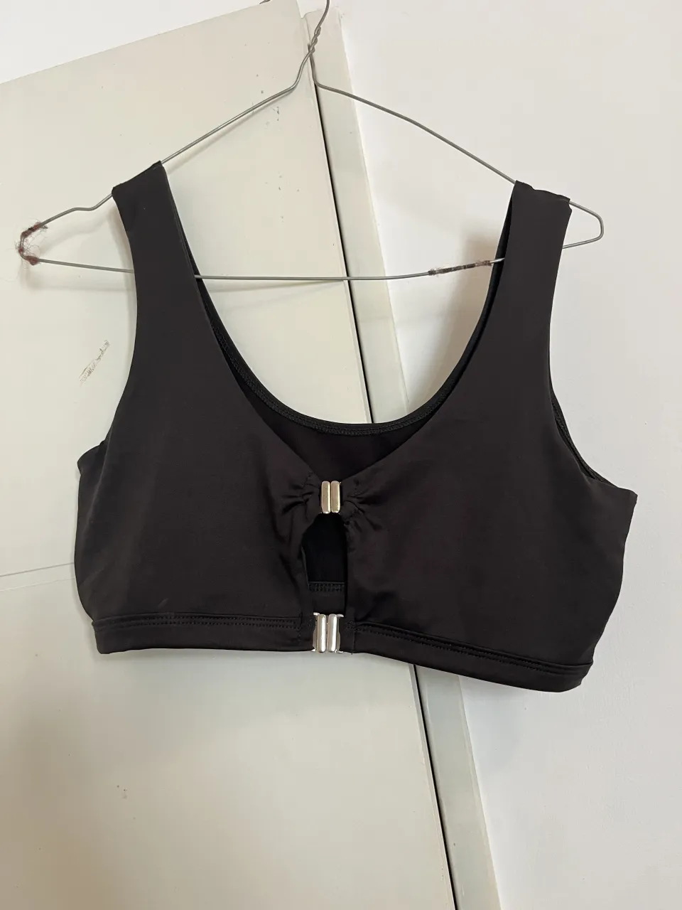 Top deportivo negro con detalle de hebillas plateadas en el frente. Ideal para entrenar o usar en un look casual.