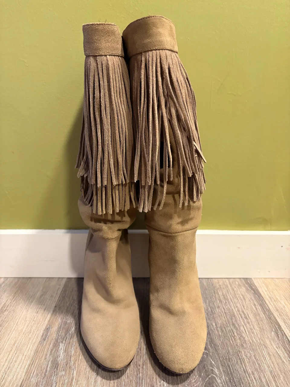 Botas de caña alta color suela con flecos y taco. Un diseño súper canchero y original para darle un toque boho a tu look.
