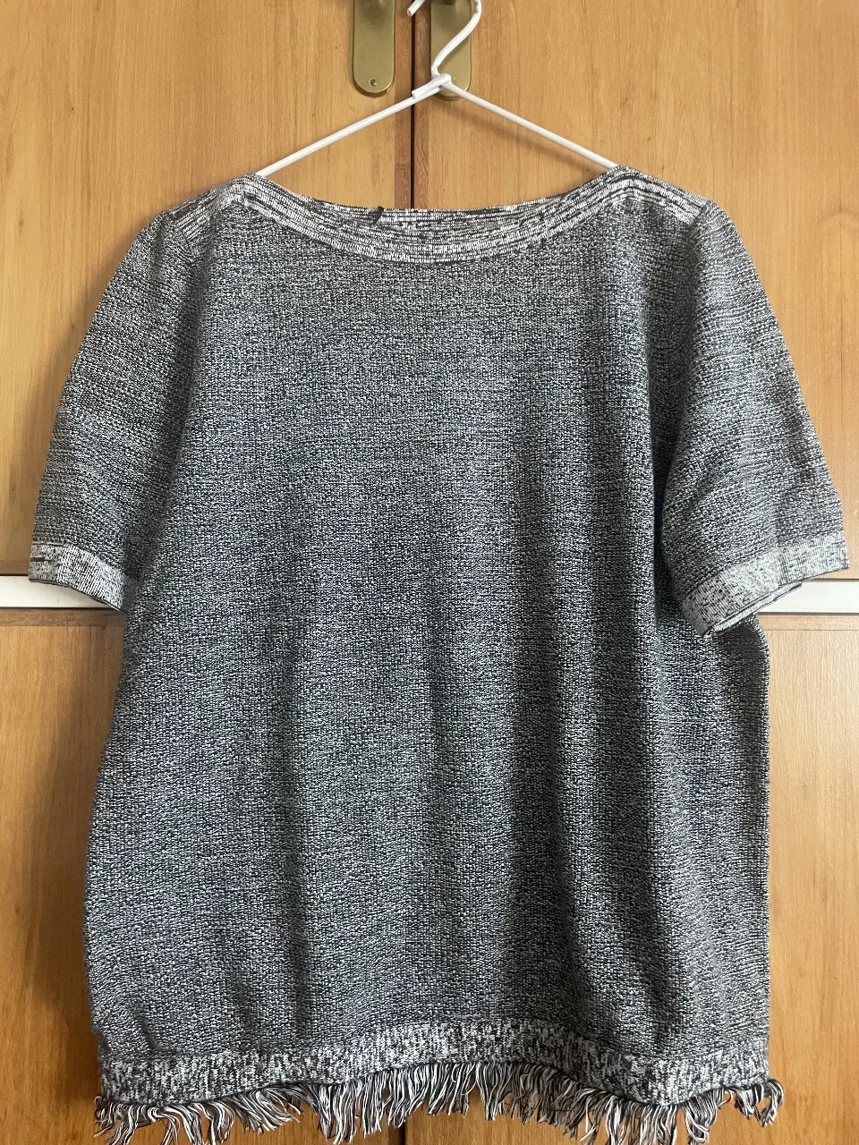 Remera de tejido gris jaspeado con detalles de flecos en el bajo. Manga corta y cuello redondo. Ideal para un look casual y moderno. impecable! poco y nada de uso.