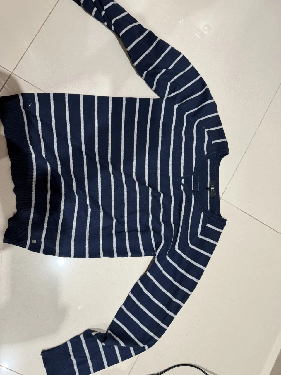 Sweater de algodón a rayas verticales, azul marino con líneas blancas. Cuello redondo y mangas largas.