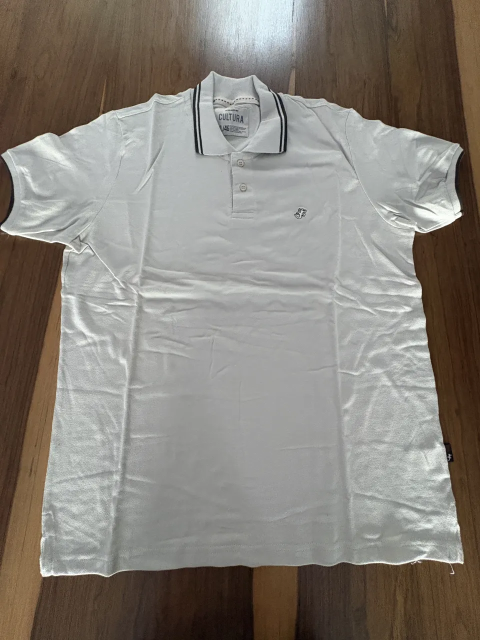 Remera polo de manga corta color blanco roto con cuello y detalles en las mangas en negro y blanco. Tiene un pequeño bordado en el frente.