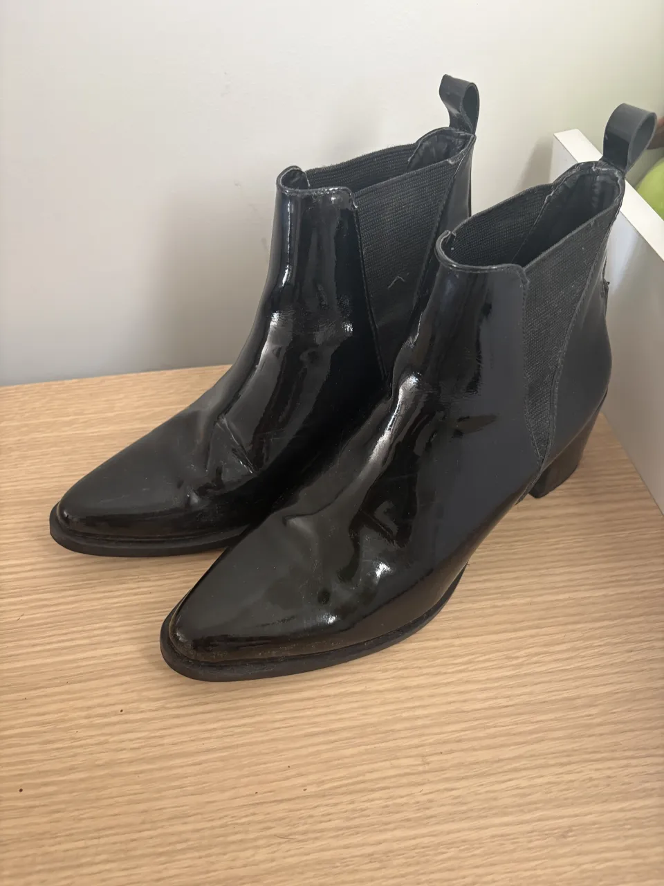Botitas de charol negras con taco de 6cm. Tienen elástico a los costados y tirita en la parte trasera para ponérselas fácil.