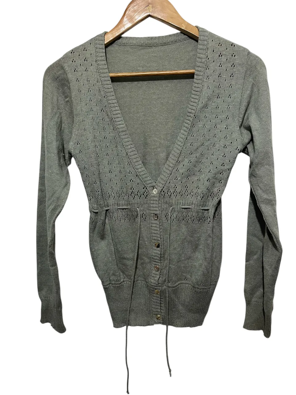 Cardigan gris de manga larga con botones y cordón ajustable en la cintura. Posee un delicado tejido calado en la parte superior y detalles de costura que le dan un toque moderno y femenino. Ideal para complementar tus outfits.