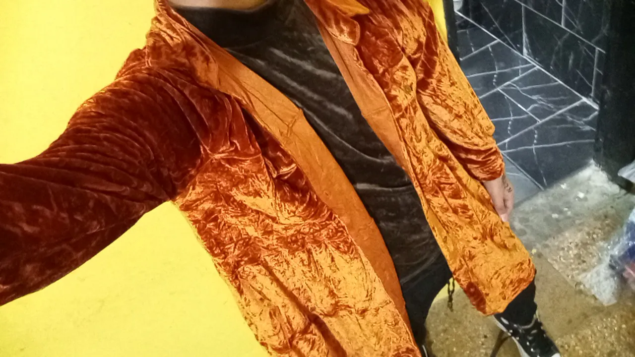 Abrigo largo de terciopelo en un vibrante color naranja quemado. Su textura suave y brillante lo hace ideal para destacar en cualquier ocasión. Perfecto para darle un toque de estilo y sofisticación a tu look.
