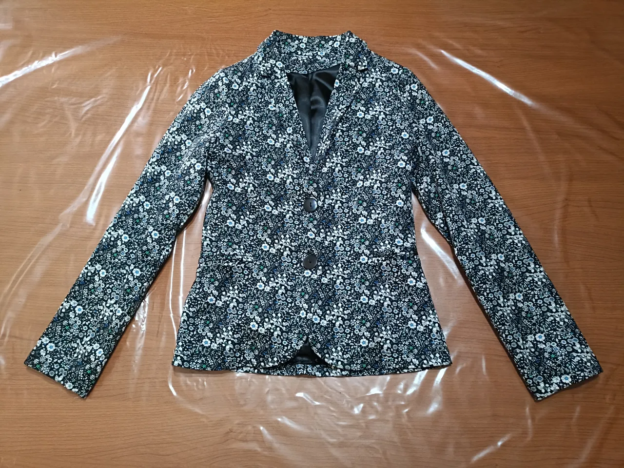 Blazer estampado floral con dos botones al frente, bolsillos de vista y forro interno de satén. Colores negro y blanco, y detalles en azul y verde. La tela elastiza aún poco.