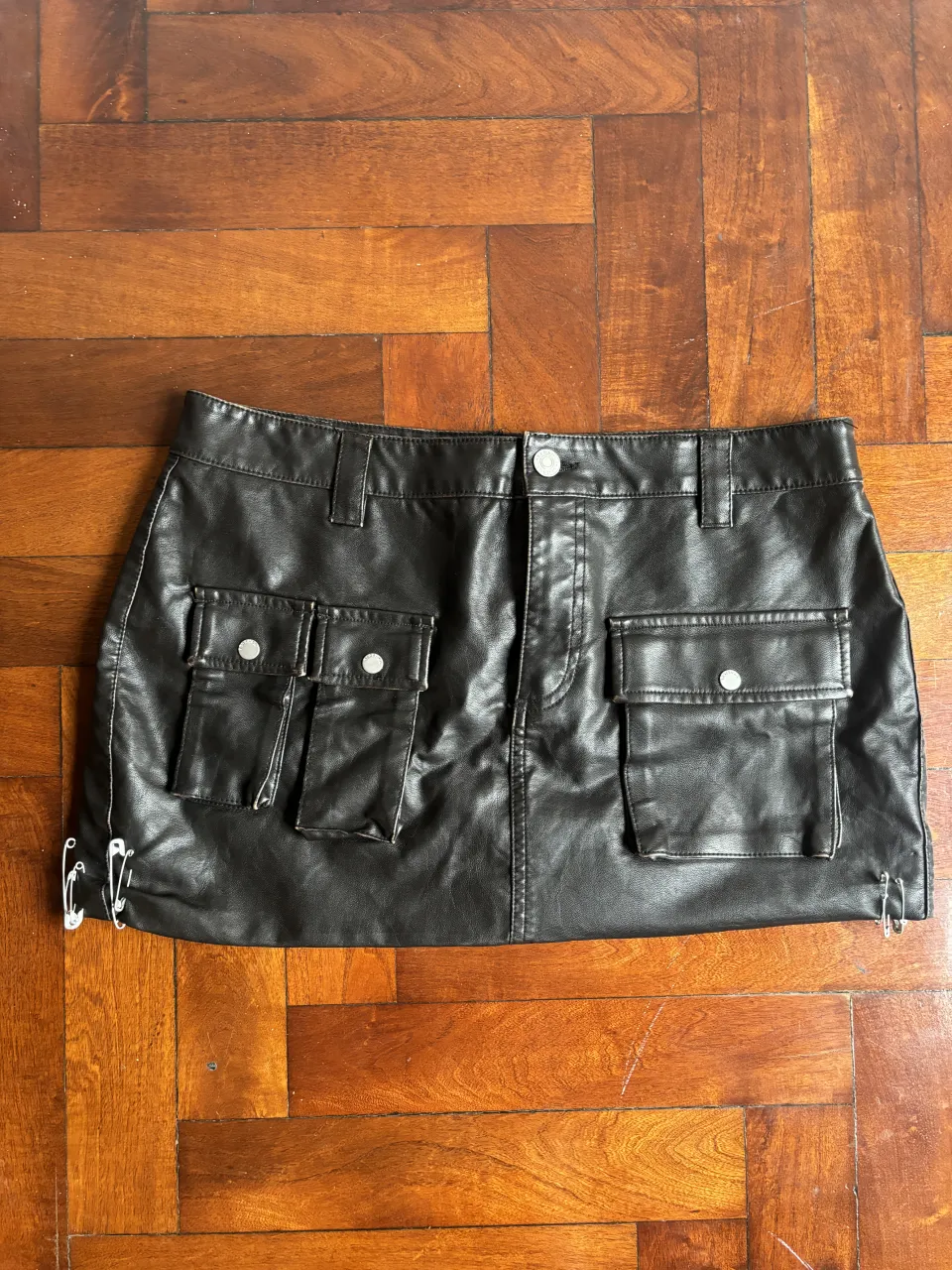 Pollera de cuero negra, con bolsillos cargo y detalles de ganchos de seguridad en los laterales y el ruedo. Un diseño audaz y moderno, ideal para un look canchero y con actitud.