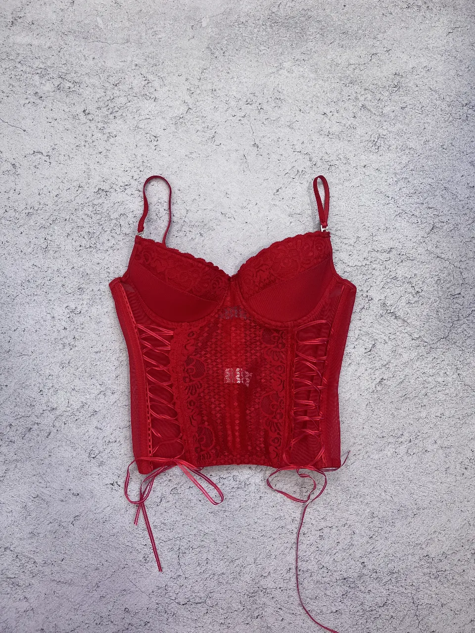 Corset rojo con detalles de encaje y tiras cruzadas en los laterales. Ideal para un look audaz y sensual. Talle M pero busto de 90