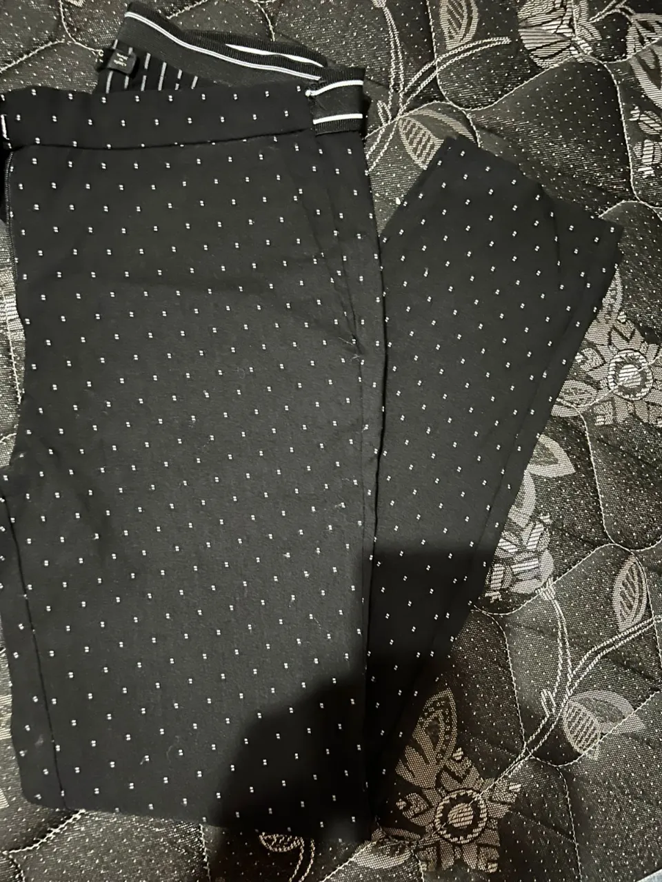 Pantalón negro con estampa de lunares blancos. Tiro alto, corte recto y cómodo. Ideal para un look casual o de trabajo.