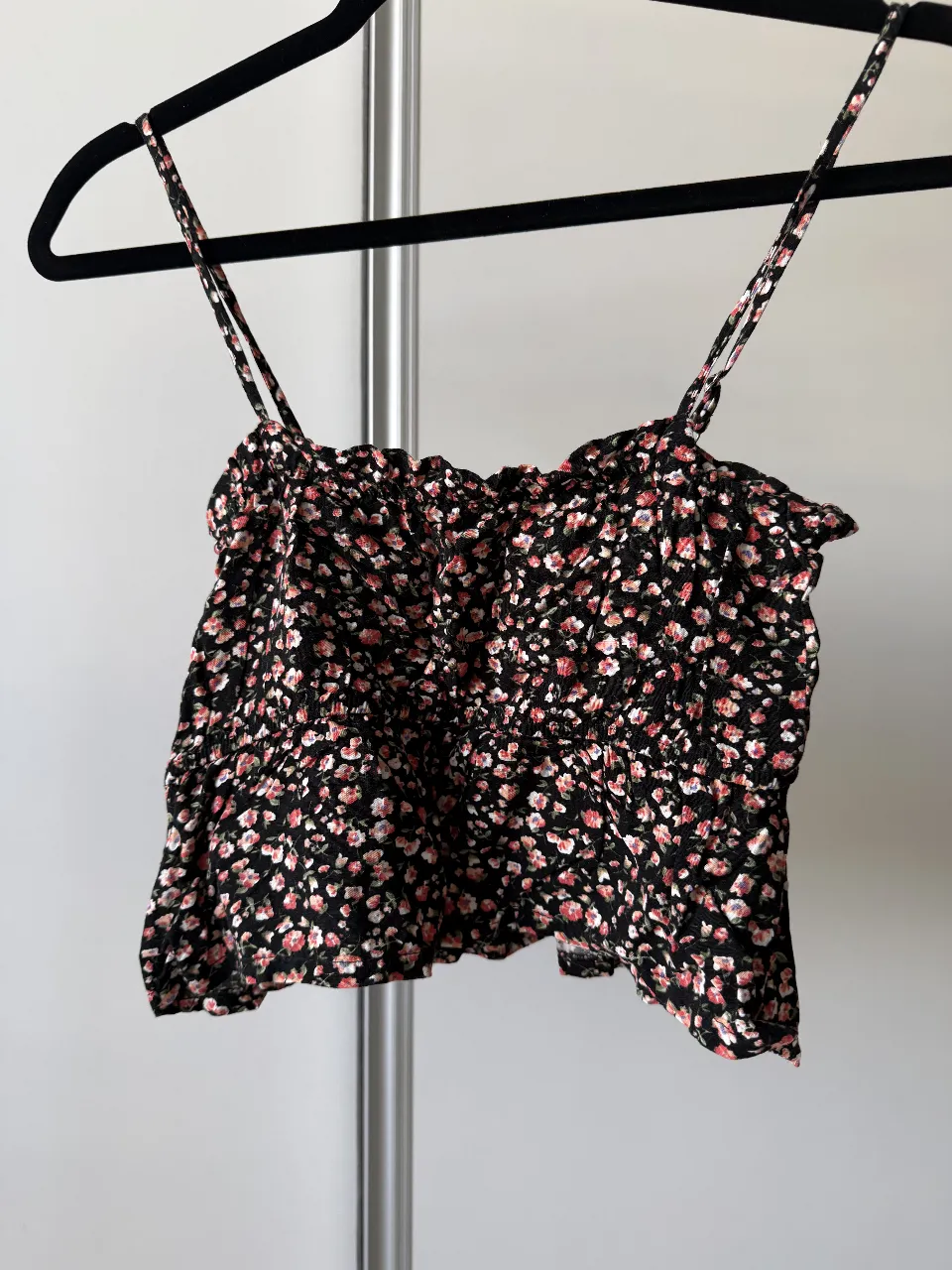 Top floreado súper cute, ideal para el verano o una salida casual. Tiene tiras finas y un detalle fruncido en el busto que lo hace súper canchero. El estampado es de flores pequeñas sobre fondo negro, súper combinable.