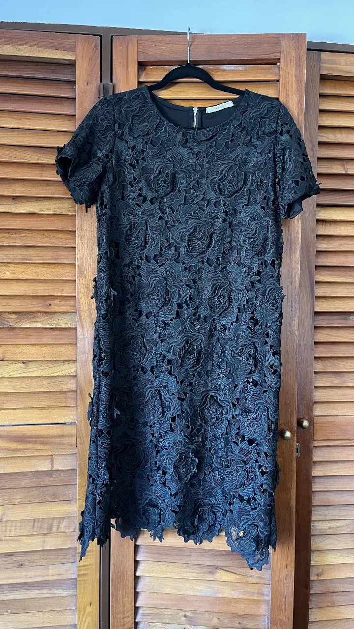 Vestido negro de encaje con flores en relieve. Manga corta y largo hasta la rodilla. Ideal para eventos o salidas elegantes. largo desde nuca:95cm ancho cintura: 50cm sisa: 50cm