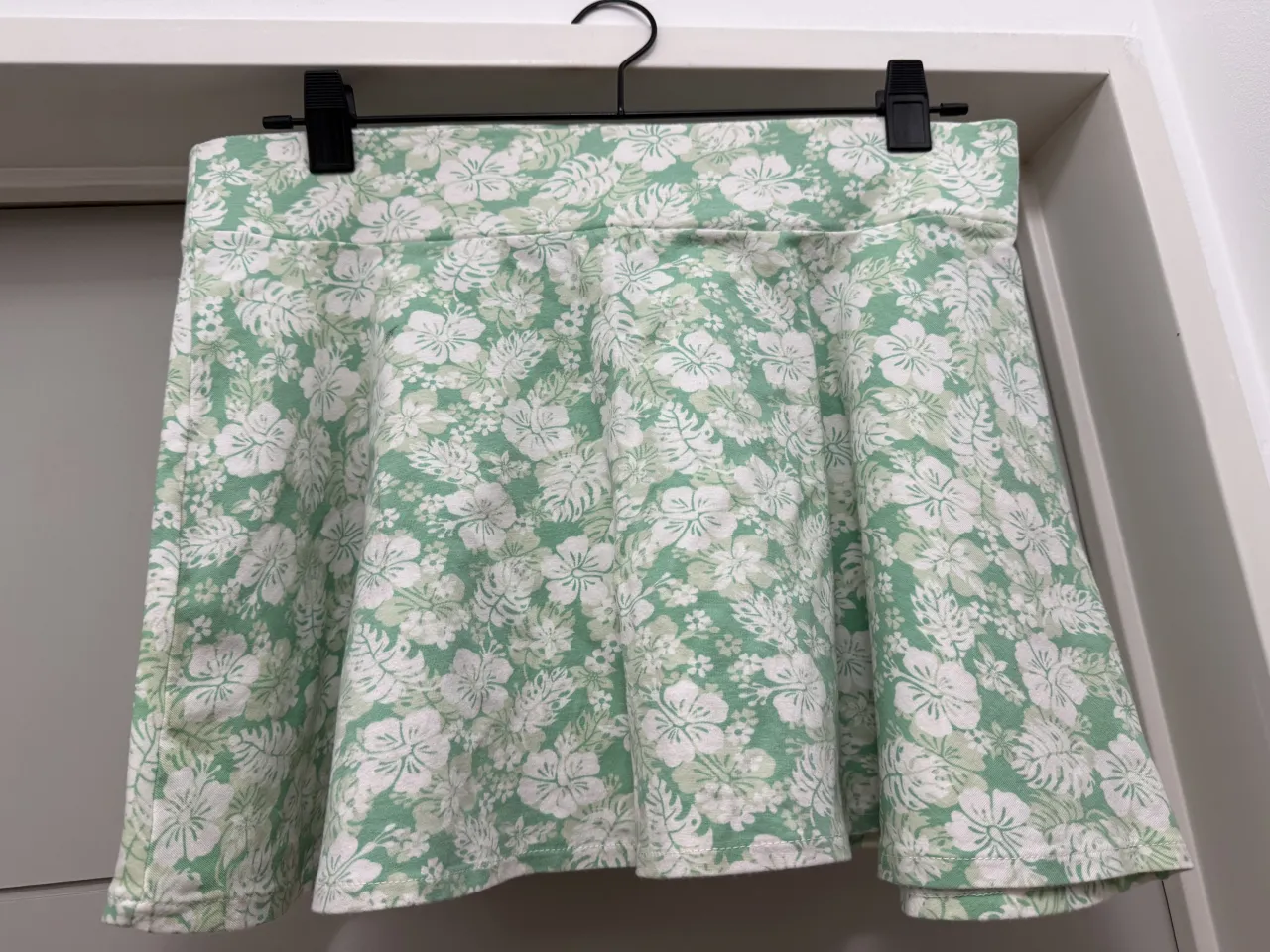 Pollera corta con estampado floral vibrante en verde y blanco. Ideal para un look fresco y playero.