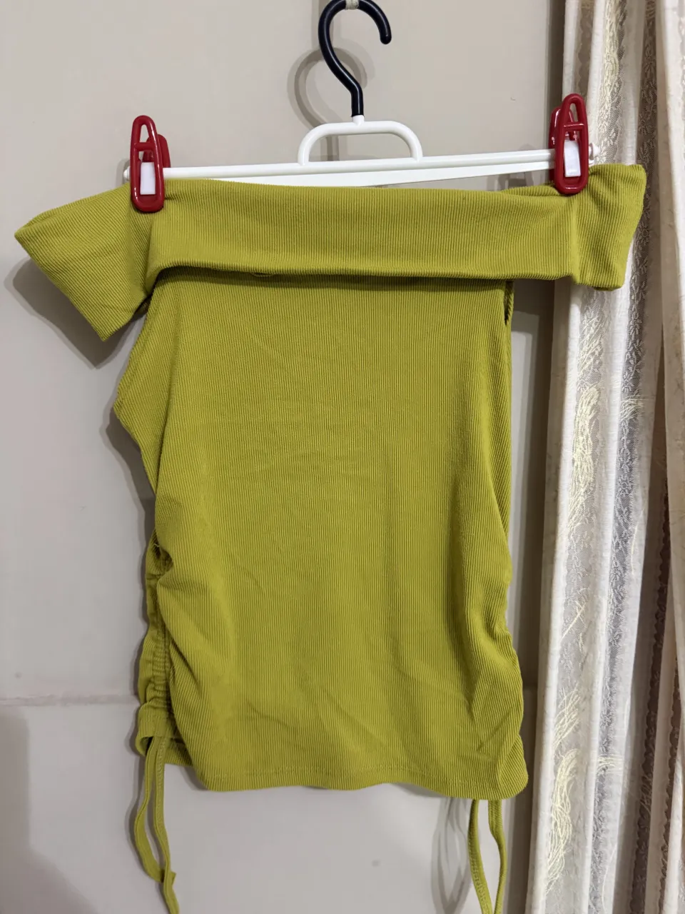 Remera color verde lima, con escote Bardot y detalle de fruncido con tiras regulables en los laterales. Al cuerpo
