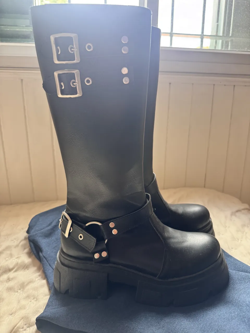 Botas de caña alta negras con plataforma y hebillas. Estilo punk/gótico, perfectas para un look audaz y moderno. Cierre lateral para mayor comodidad.