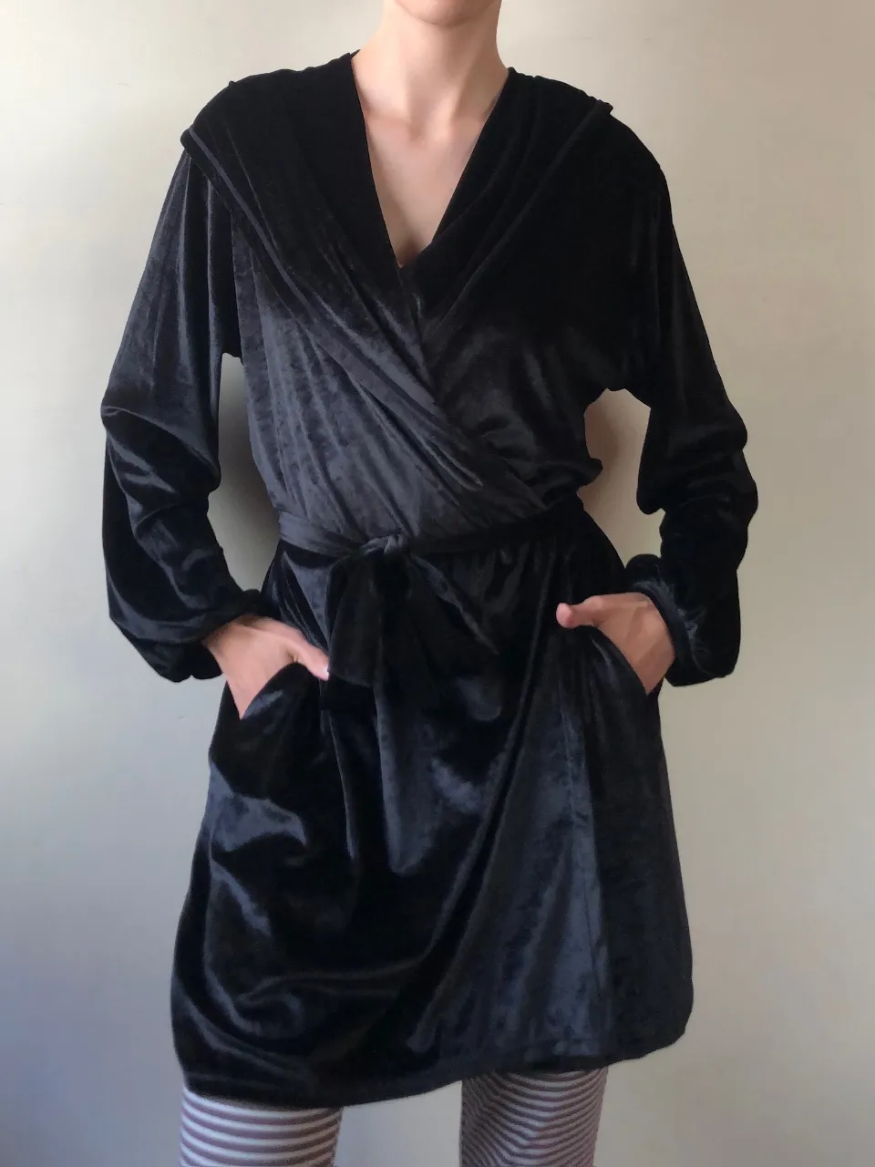 bata negra de terciopelo con capucha, mangas largas, bolsillos y cinturón. Ideal para estar cómoda en casa
