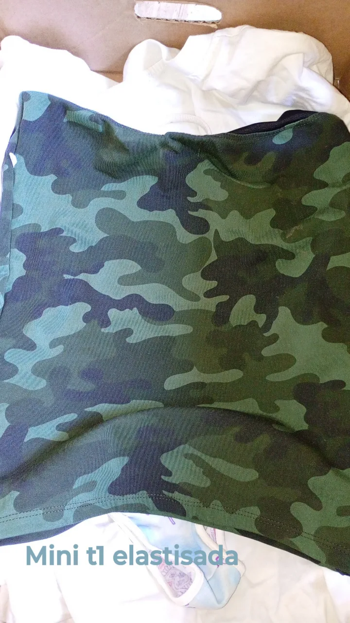 Mini falda elastizada con estampa camuflada en tonos verdes y negros. Ideal para un look canchero y moderno.