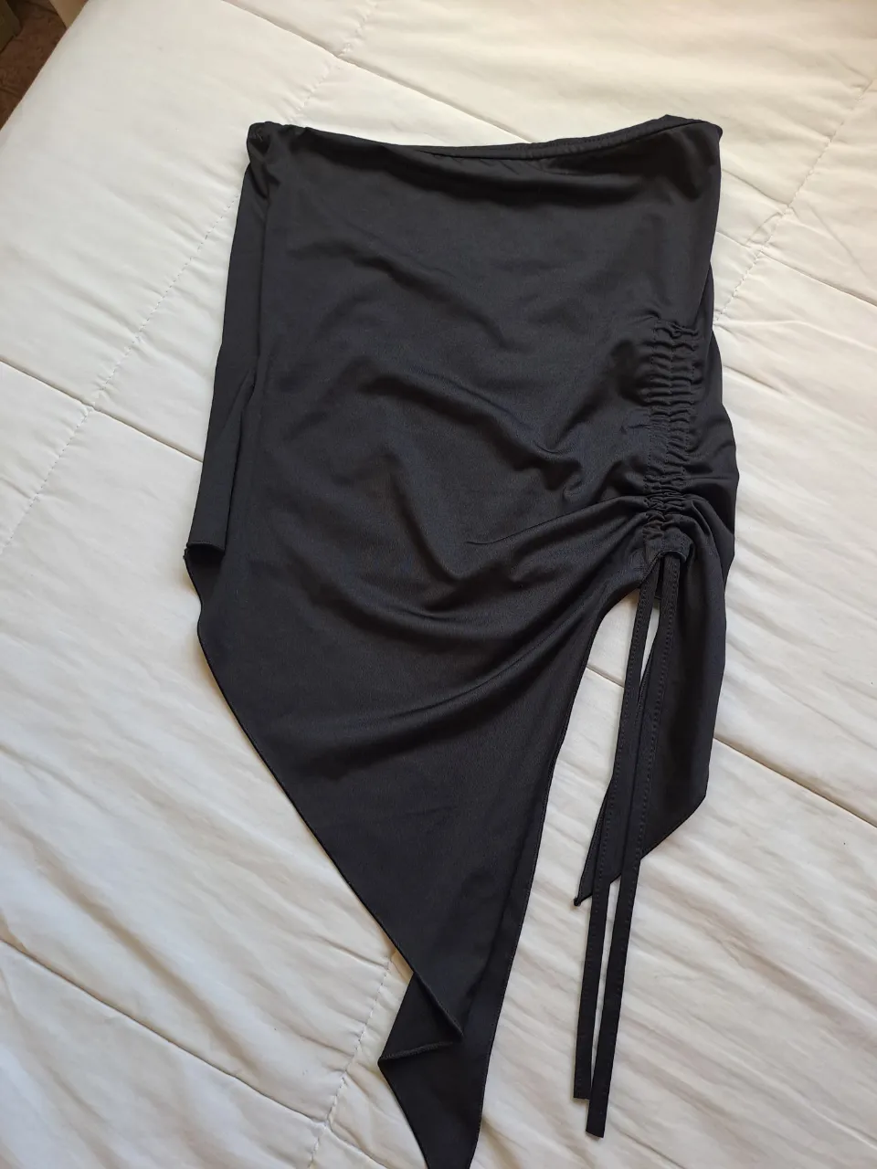 Pollera negra asimétrica con fruncido y tajo lateral. Ideal para un look canchero y moderno.