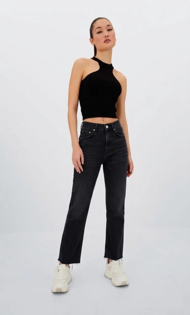 Jeans negros tiro alto con corte al ras y detalles desflecados en los bajos. Un básico moderno para tu día a día.