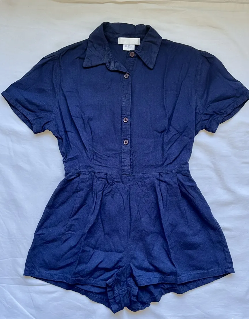 Mono corto azul marino, con cuello de camisa y botones al frente. Tiene un corte en la cintura y shorts con pliegues. Ideal para un look casual y fresco.