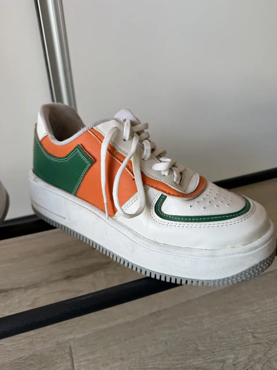 Zapatillas urbanas con plataforma, estilo retro. Combinan blanco, naranja y verde, con cordones blancos y suela gruesa. Ideales para un look casual y moderno.