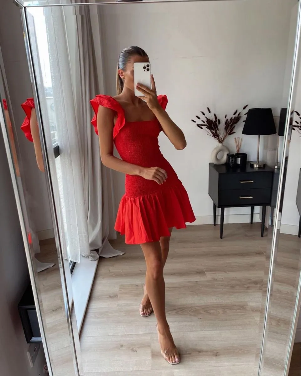 Vestido rojo con mangas cortas con volados y escote cuadrado. La parte superior y la falda tienen elástico fruncido. Tiene un solo uso.