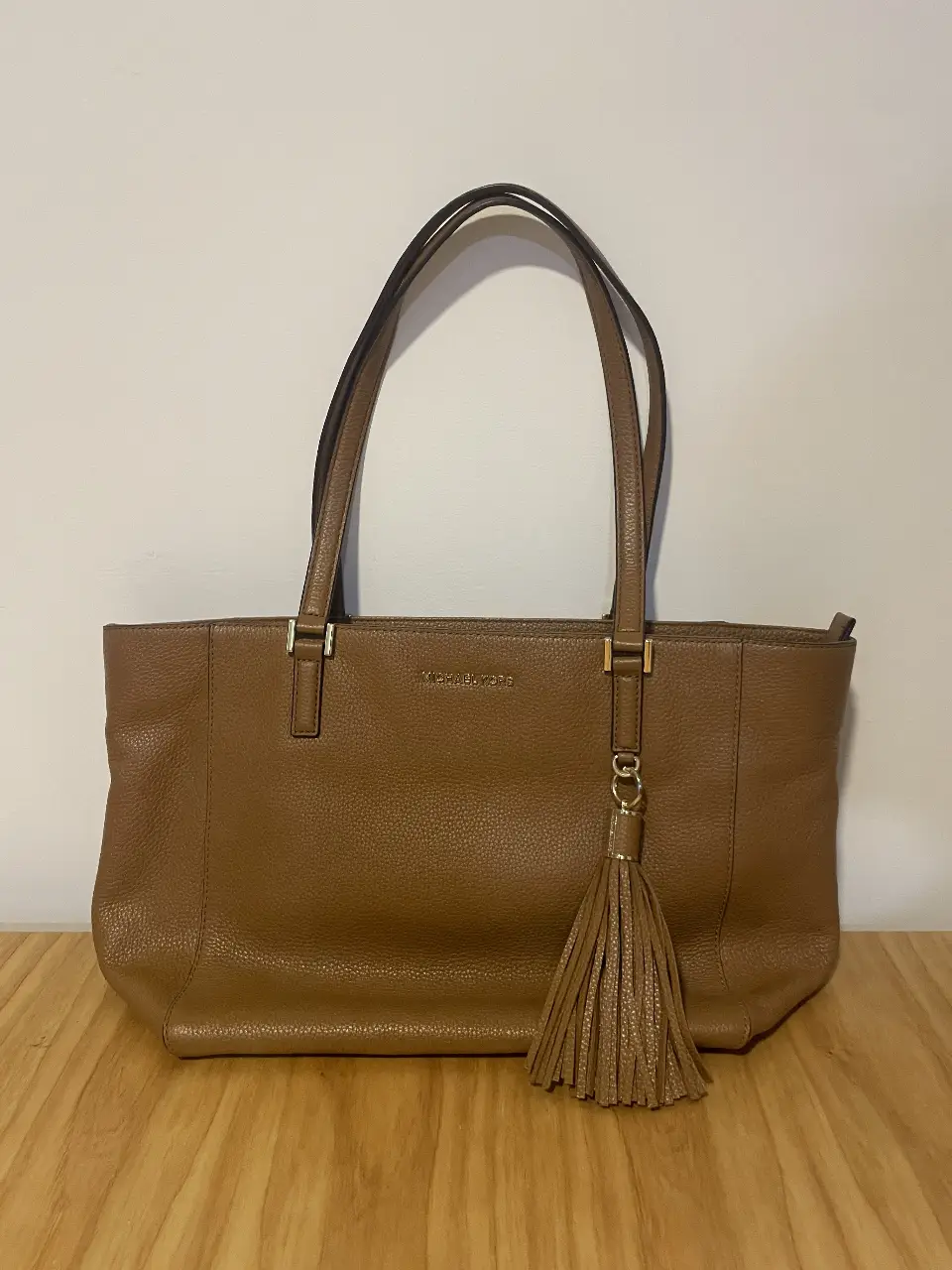 Cartera tote bag de cuero marrón, con manijas superiores y detalle de borla. Ideal para llevar todo lo necesario con estilo.