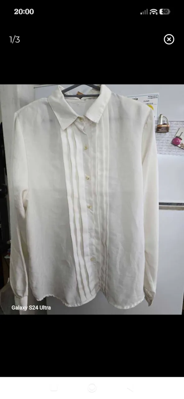 Camisa blanca de vestir con detalles de plisado en el frente y botones nacarados. Manga larga, ideal para un look elegante y formal.