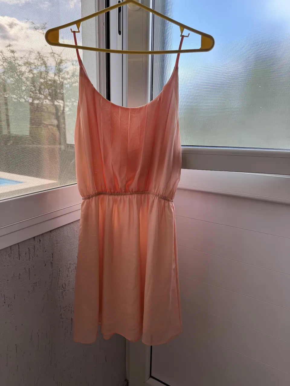 Vestido corto de breteles finos, con elástico en la cintura y falda suelta. Posee detalles de pliegues en la parte superior. da para un S/M más para M diría