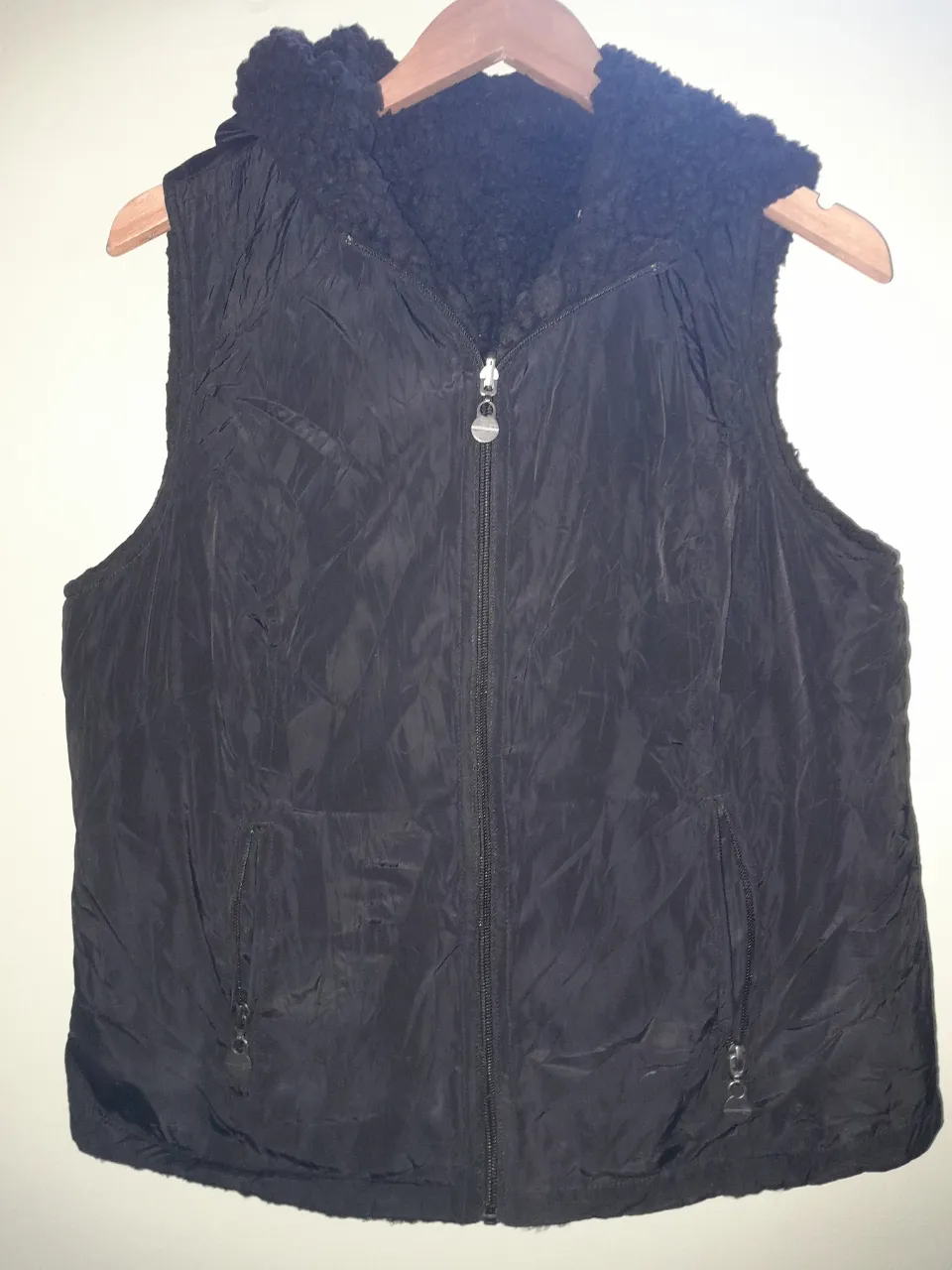 Chaleco negro con capucha forrada en piel sintética. Cierre frontal completo y bolsillos laterales con cierre.