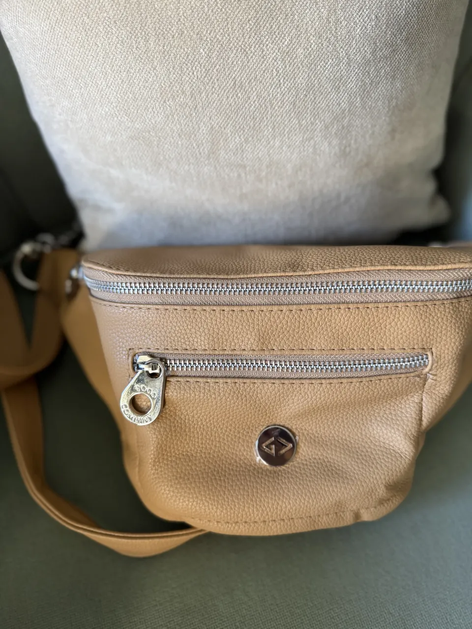 Riñonera de cuero color camel, súper práctica y canchera. Tiene dos cierres principales y un bolsillo exterior con cierre. El interior está forrado con un estampado de logo repetido. Ideal para llevar lo esencial con estilo. Tiene bolsillo atras