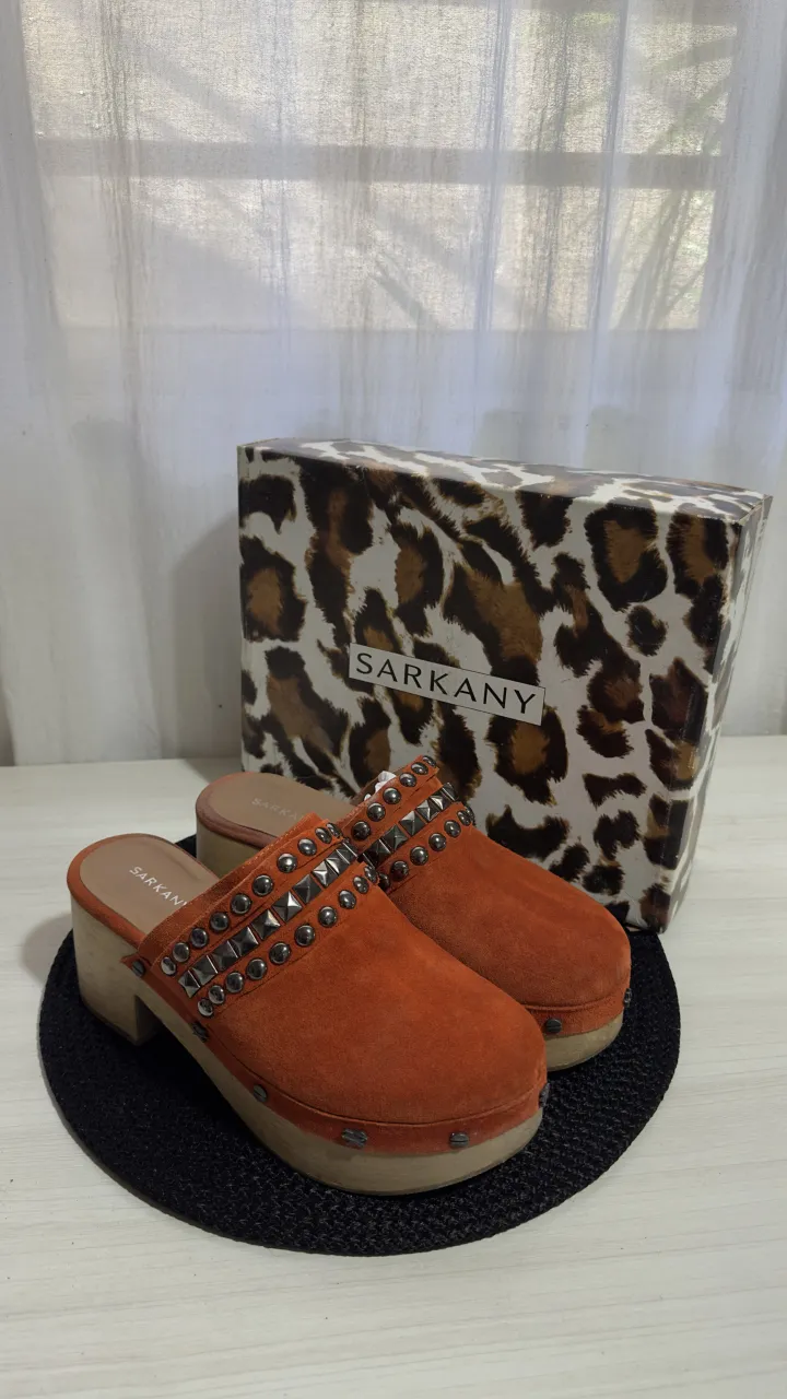 Zuecos de gamuza naranja con tachas plateadas alrededor de la capellada y taco de madera.