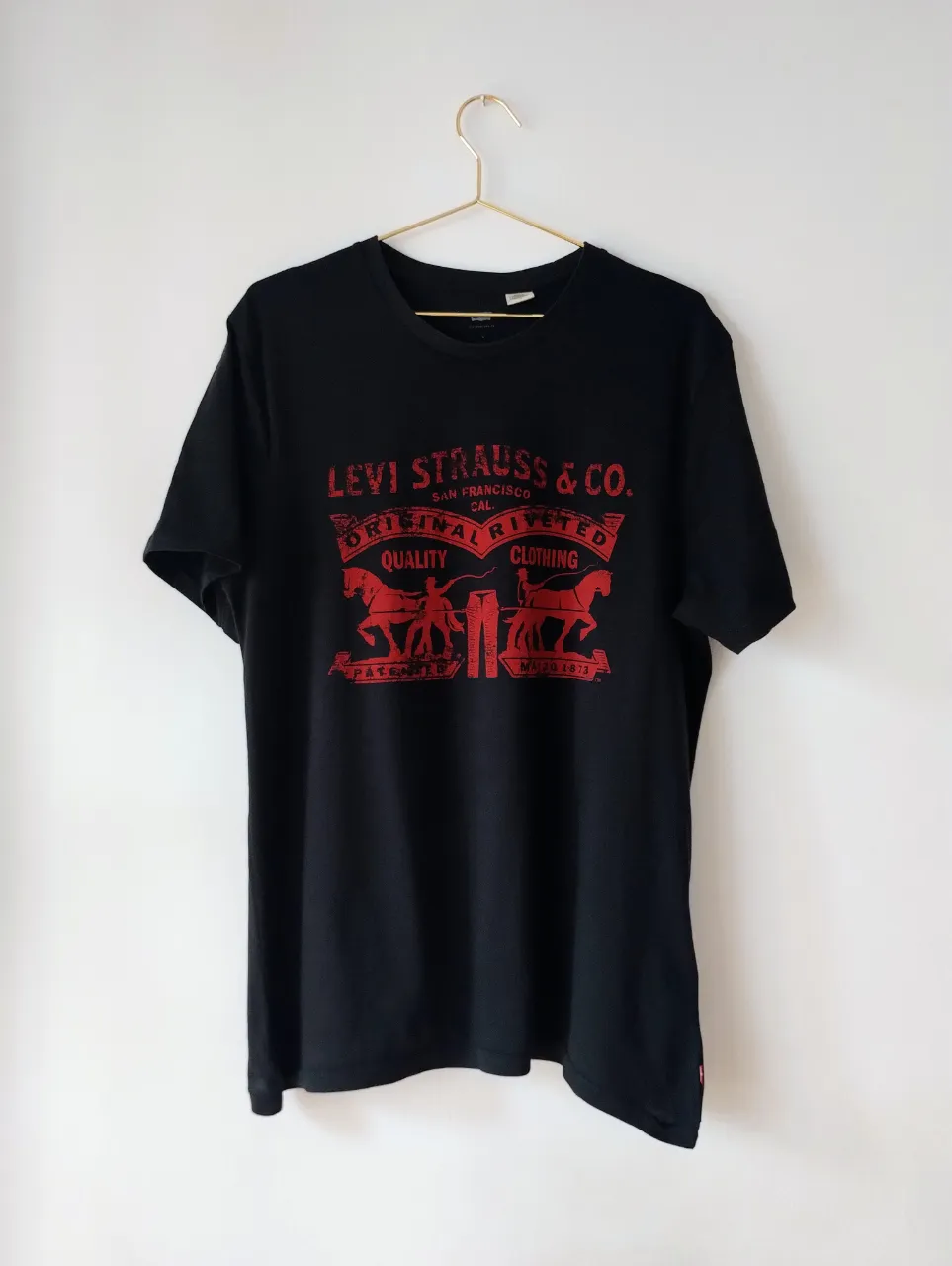 Remera negra Levis de manga corta con estampa del logo de Levi's Strauss & Co. en rojo en el frente. talle L