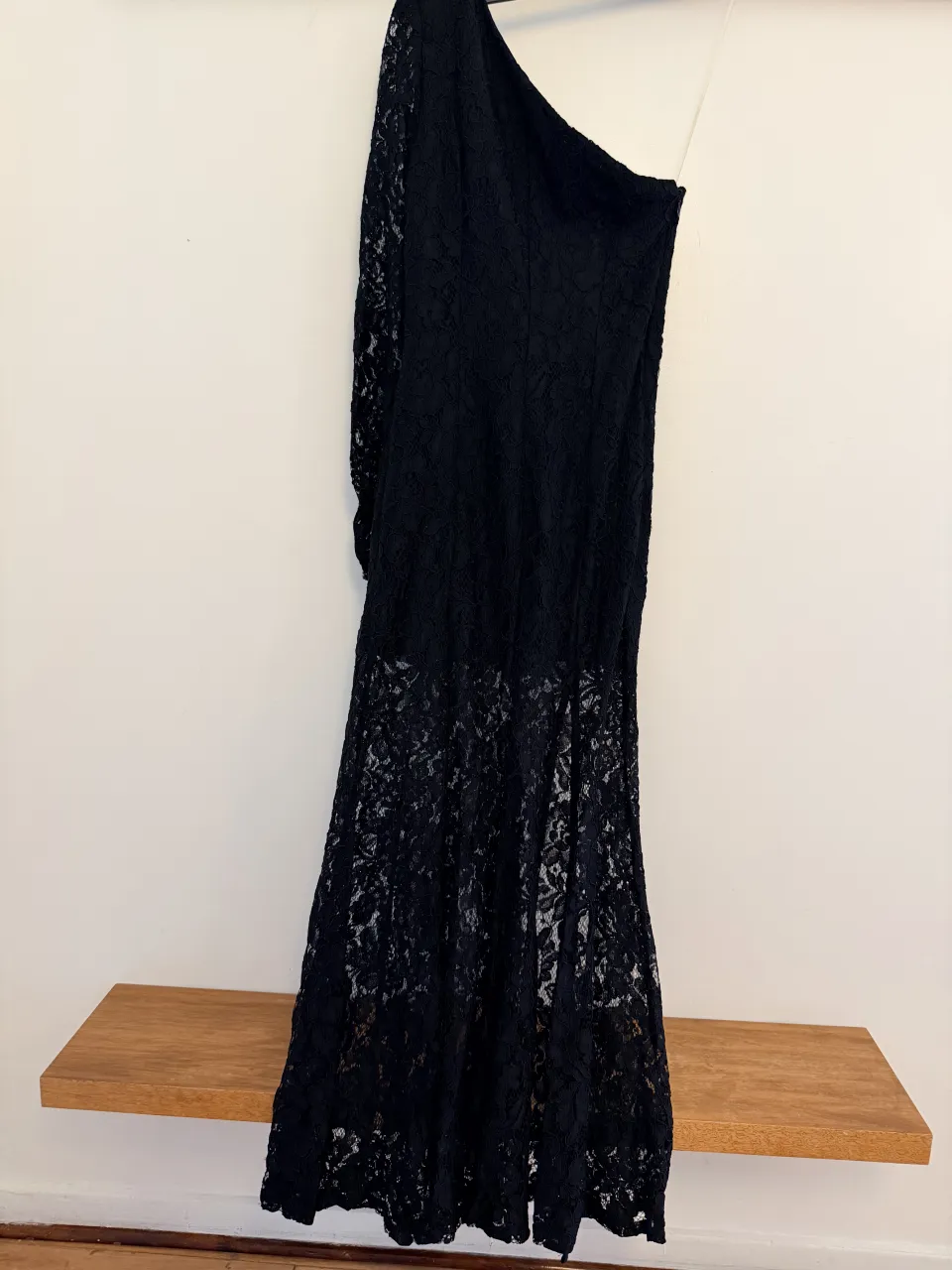 Vestido negro largo de encaje, con un solo hombro y manga larga en un lado.