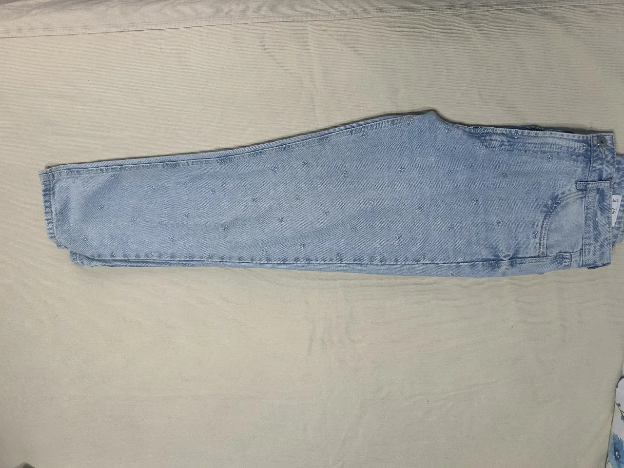 Jeans tiro alto de denim celeste con bordado de pequeñas flores. Un básico canchero para tu día a día.