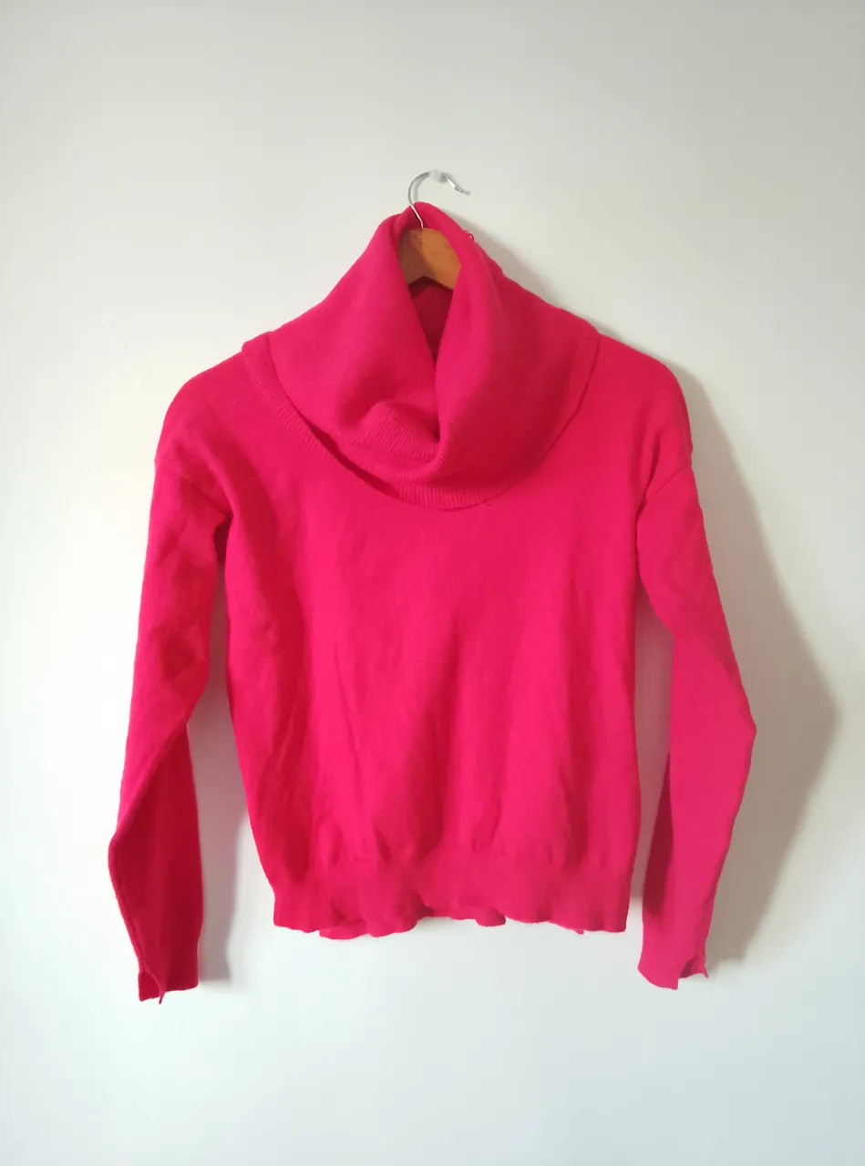 Sweater rojo elastizado con cuello grandísimo. Medidas: 47cm axila a axila y 52cm largo. Material: 75% viscosa y 25% poliamida. Detalle: tiene un detallito de enganchadura en el cuello por lo que se puede disimular doblandolo. Talle: no sé sabe. Consejo, dejarse llevar por las medidas de la prenda, no por el talle (porque puede variar)