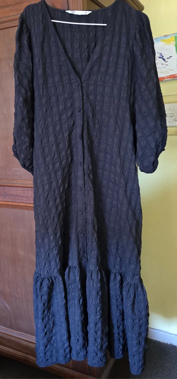Vestido negro largo con botones al frente y volado en la falda. Posee mangas cortas abullonadas y un escote en V. Su textura es única y le da un toque especial.