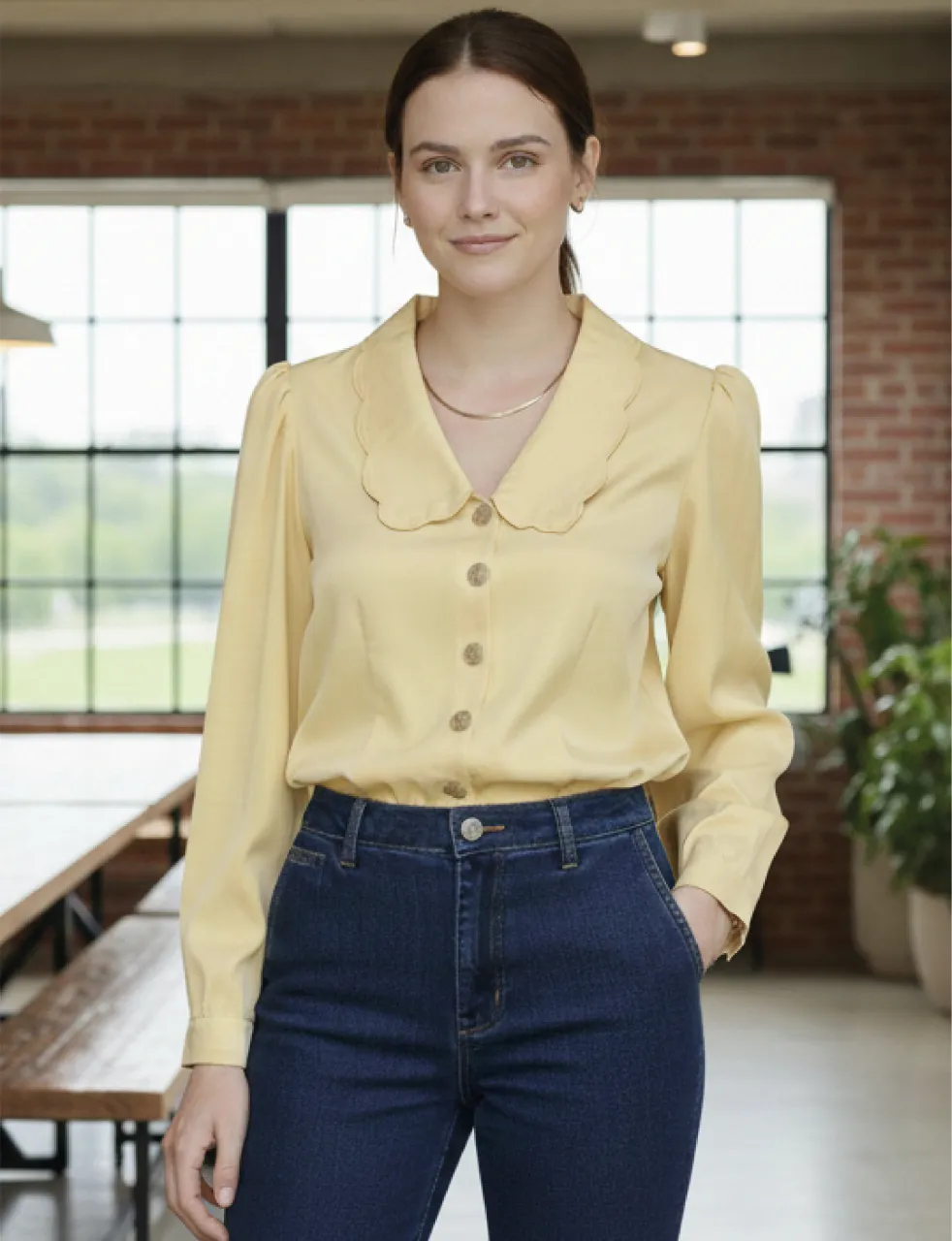 Camisa vintage de color amarillo pastel con cuello redondo festoneado y mangas largas abullonadas. Posee botones dorados con detalles brillantes y un diseño delicado que la hace única. Perfecta para un look elegante y retro.
