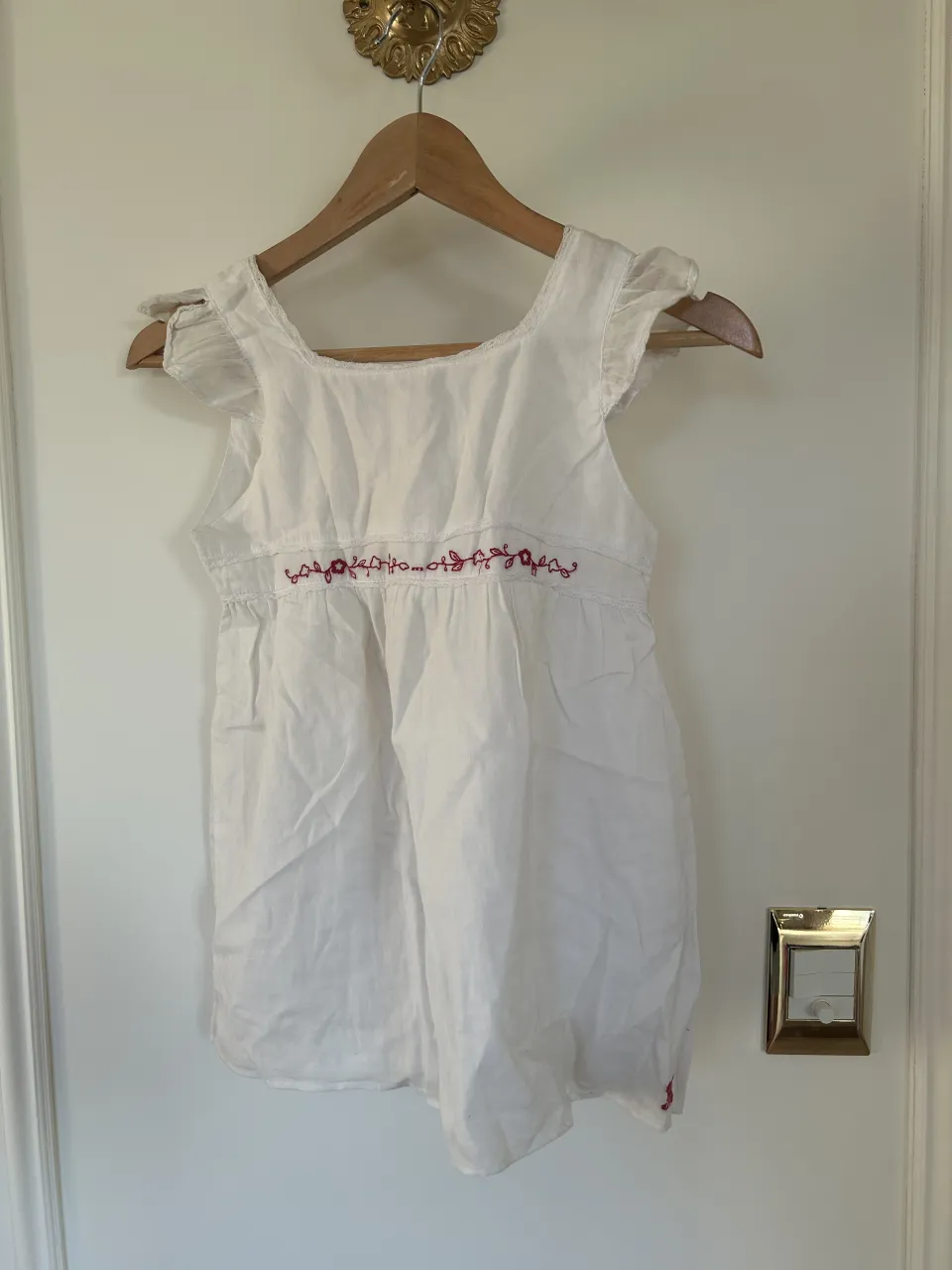 Remera blanca de algodón con detalles bordados en color rosa en la parte delantera. Tiene volados en los hombros y un detalle de fruncido en el busto. Presenta una pequeña mancha amarillenta en la parte inferior delantera.