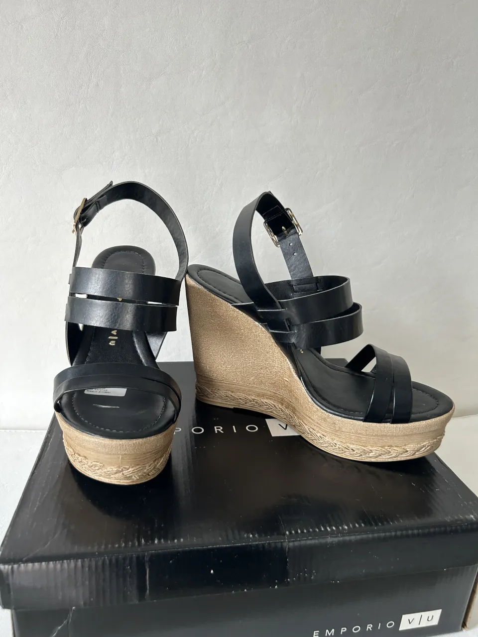 Sandalias negras con tiras y taco cuña de yute.