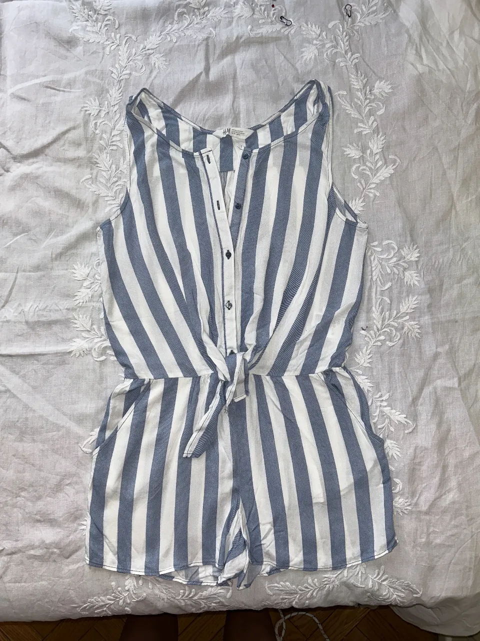 Mono corto a rayas blancas y azules, con nudo en la cintura y botones al frente. Ideal para un look casual de verano.