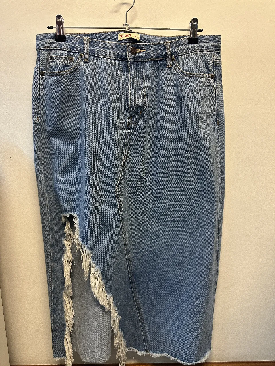 Pollera de jean larga, tiro alto, con rotura y detalles desflecados en la pierna. Un diseño moderno y canchero para lucir en cualquier ocasión.
