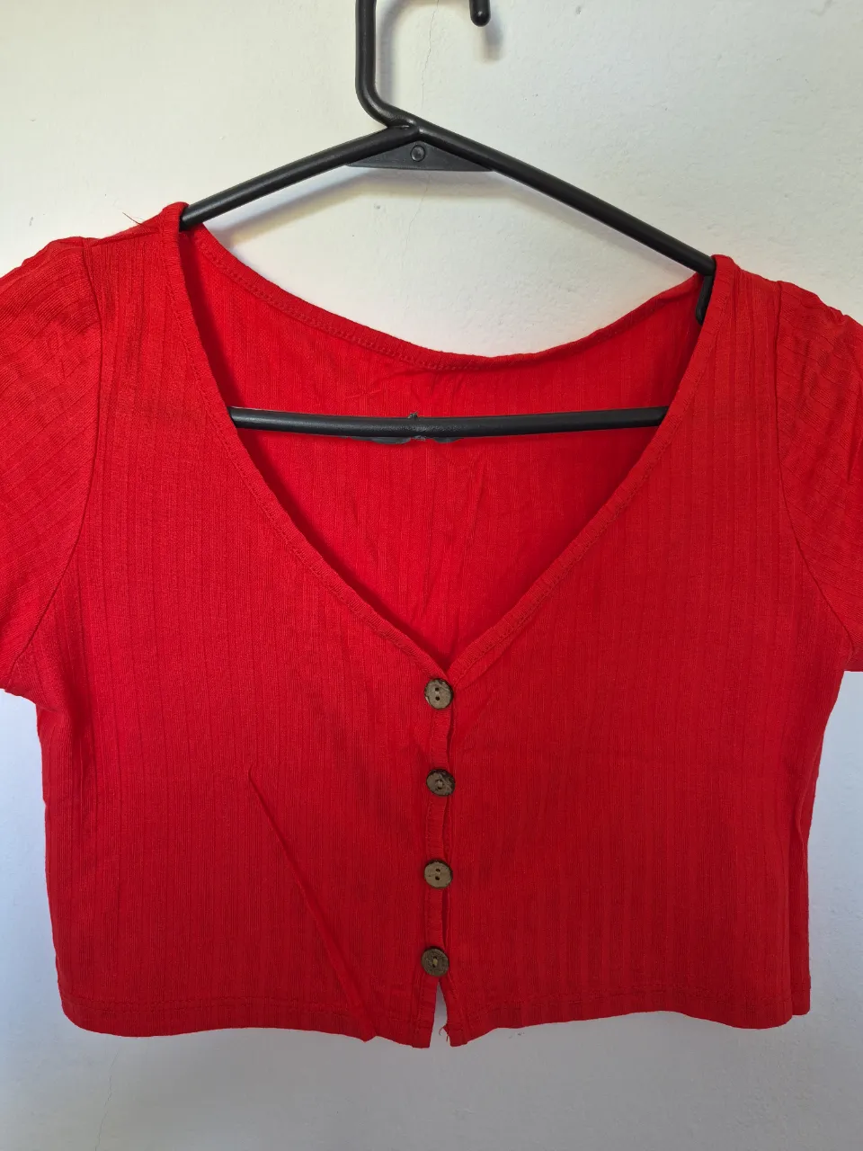 Remera roja escote en V con botones de madera en el frente. Mangas cortas.