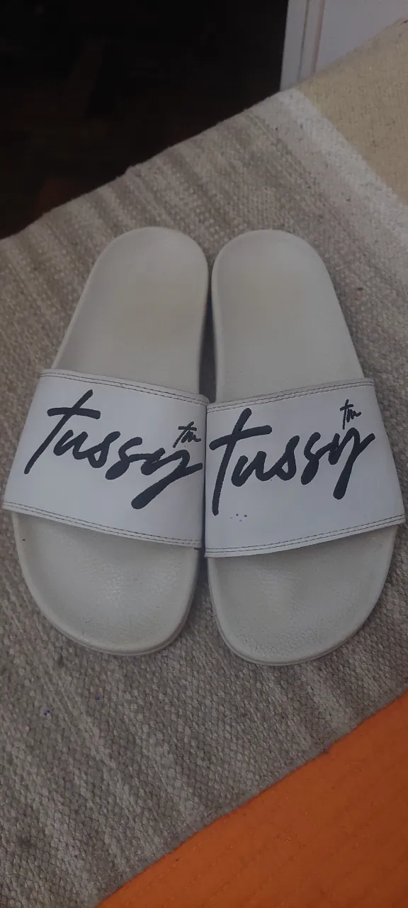 Ojotas blancas con estampa negra de la marca "Tussy". Ideales para el verano, la playa o para estar cómodo en casa.