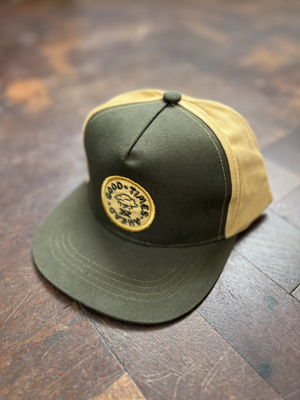 Gorra trucker de dos tonos, verde y beige, con un parche bordado al frente que dice "GOOD TIMES AHEAD".